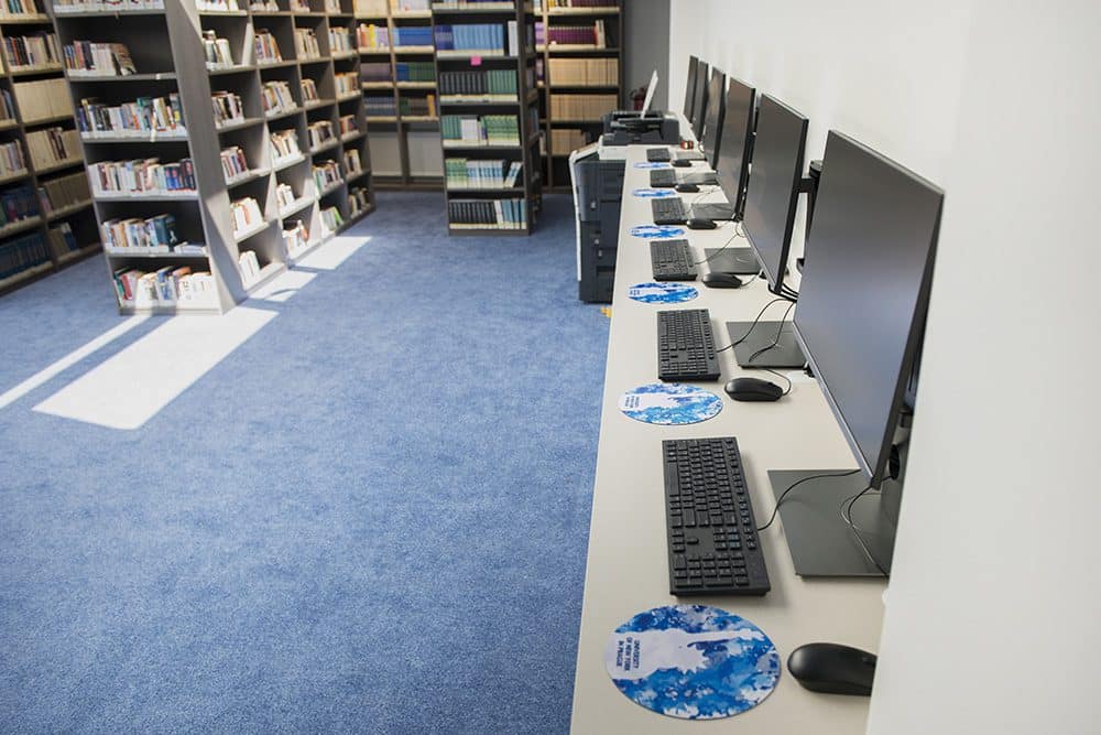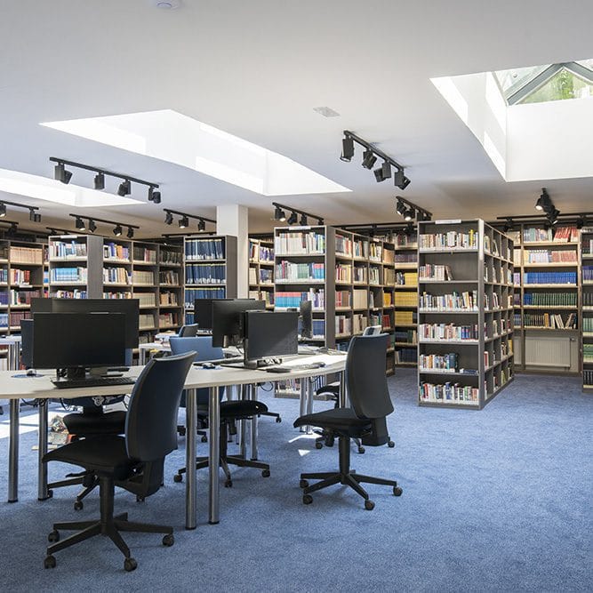 Knihovna University of New York in Prague se nachází v Londýnské 32. Disponuje asi 17,000 knihami, časopisy a audio-vizuálními materiály (většina z nich je v angličtině). Kromě akademické literatury je v knihovně k zapůjčení rostoucí počet titulů neakademického charakteru.
