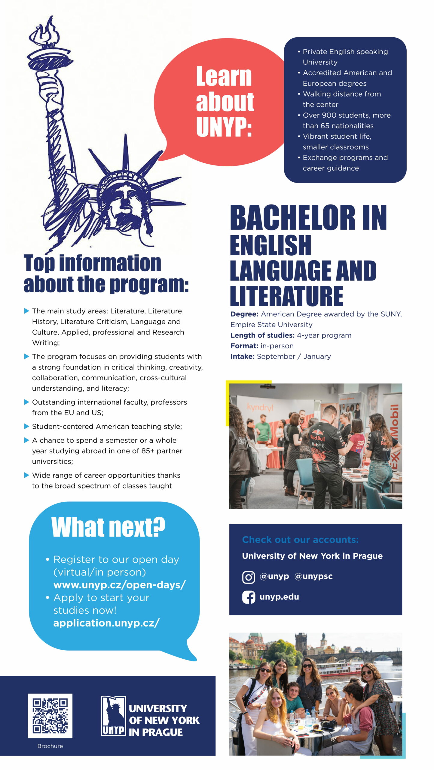 Explore the power of language, literature, and culture with the Bachelor of English Literature at the University of New York in Prague. Taught entirely in English, the program combines the study of English language and literature, linguistics, cultural studies, and communication to prepare you for global careers or advanced study.