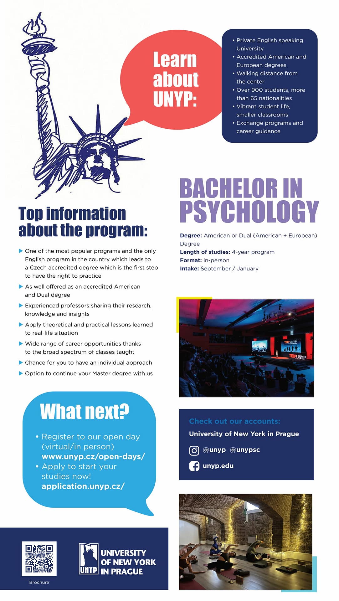 Explore the science of human behavior, thought, and emotion with the Bachelor of Psychology at the University of New York in Prague. This dual-degree program lets you earn two fully accredited bachelor’s degrees — one American degree from SUNY Empire State University and one Czech-accredited degree from UNYP — all while studying in English in one of Europe’s most international cities.